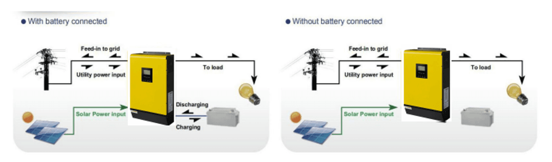 If solar power is not enough, grid can charge batteries and supply power to your load.