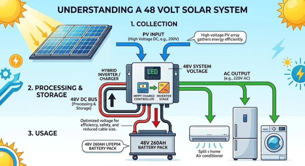 The process of a 48 Volt Solar System can be simplified into three distinct stages: