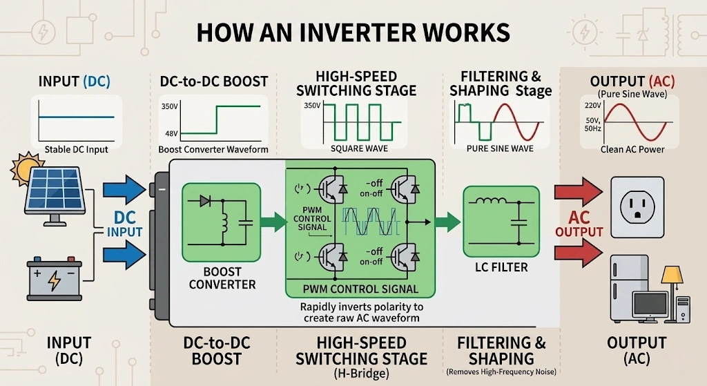As shown in the diagram above, the inverter takes the stable 48V DC input and uses a DC-to-DC Boost to reach high voltage. Then, through a High-Speed Switching Stage, it creates a raw waveform which is finally smoothed by an LC Filter into a Pure Sine Wave—identical to the power you get from the utility grid.