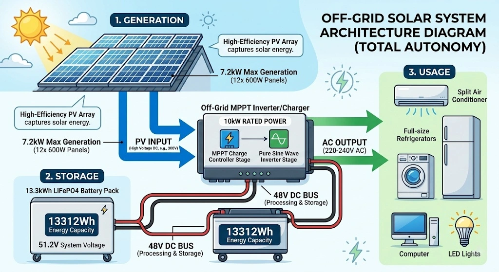 - Processing & Storage (Inverter & Battery): The 48V battery acts as the energy warehouse, while the inverter manages the flow.