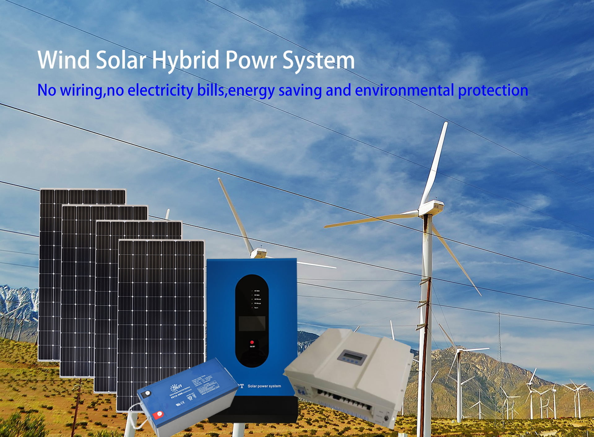 - When there is sunshine and wind, the solar panels and wind turbine will generate power and stock in the battery bank,then inverter will convert the battery DC power to AC power and take the loads