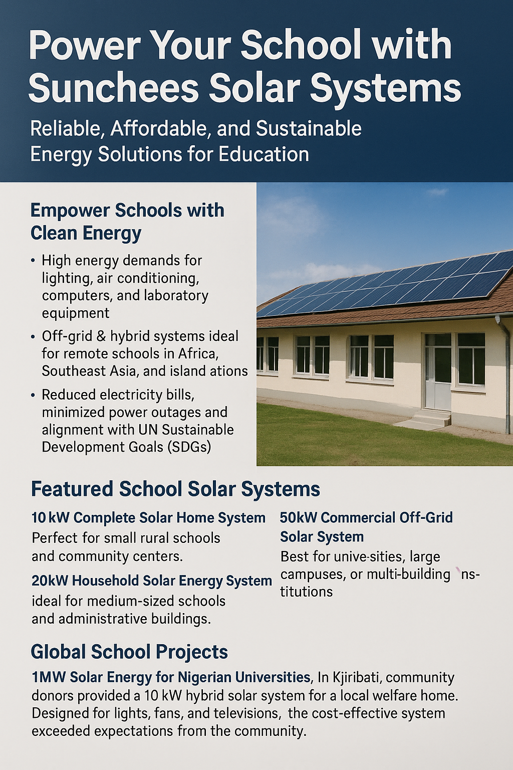 At Sunchees, we provide high-performance solar power systems designed for the unique needs of schools, uni